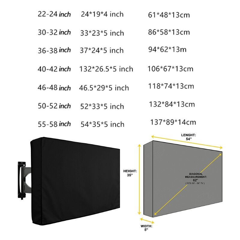 Custodia protettiva universale resistente alle intemperie per la copertura dello schermo della TV all'aperto per 22 ''a 58''Nuovo di zecca e di alta qualitàCaratteristiche:Sia che tu voglia mettere un televisore su un patio, un ponte all'aperto o in piscina, questa copertura TV fornisce protezione per tutte le stagioni per la tua preziosa TV a schermo piatto.Resistere all'aria dura, proteggere la TV da polvere, insetti, raggi UV, ghiaccio e condensa.Realizzato in tessuto oxford con rivestimento in PVC impermeabile, consente al "petto" mantenendo l'acqua, il vento e l'umidità. Cuciture rinforzate significa che il coperchio TV mantiene la forma.Ciò significa che lo stampo e l'umidità non si costruiscono sotto la copertura a causa del cambiamento della temperatura ambiente o dell'umidità. Come risultato, la tua TV non è danneggiata e resa inoperatoria a causa della "tuta".Una fodera interna più morbida e una pratica tasca per il telecomando significa che hai la copertura ideale per