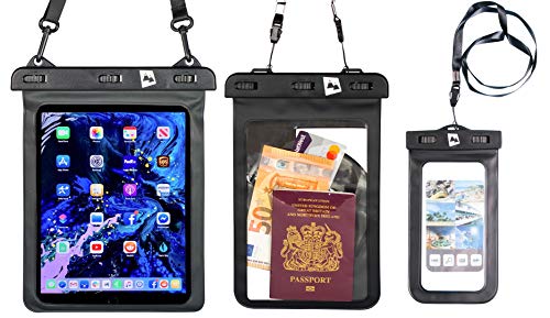 Custodia Impermeabile Universale [IPX8 Certificato] Adatta a Smartphone Tablet Fotocamere Documente e Oggetti Preziosi - Protegge da Acqua ecc. (Nero Media 21.5cm x 14.5cm per schermi da 9.7 Pollici)