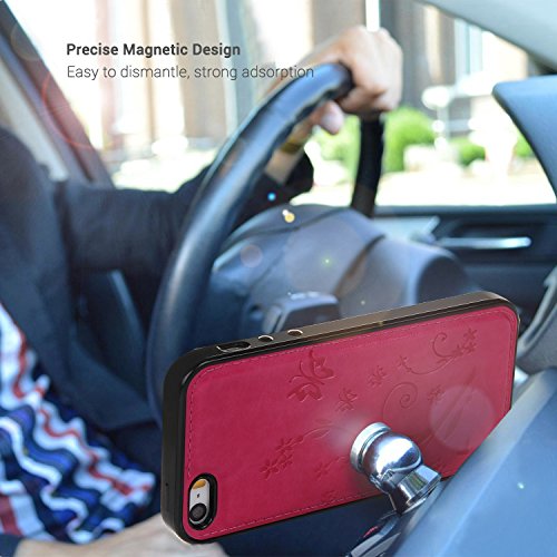 Custodia iPhone SE, iPhone 5S Cover Pelle Premium PU e Silicone TPU Case [2 in 1, Separato] - Flip Cover Morbido Leather, Goffratura Farfalla e Fiore, Chiusura Magnetica, Supporto Stand - Rosa Rosso