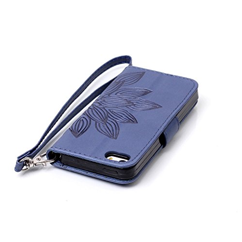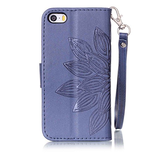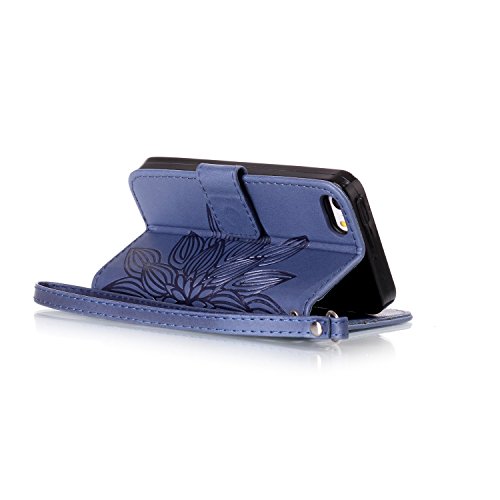 Custodia per iphone 5 iphone 5S iphone SE,Funyye Cover Pelle Elegante Libro Protettiva Copertura Con Cordino Shell Supporto Stand Porta Carte Portafoglio Flip Wallet Cover Chiusura Magnetica Proteggi Caso - Fiori Loto Blu