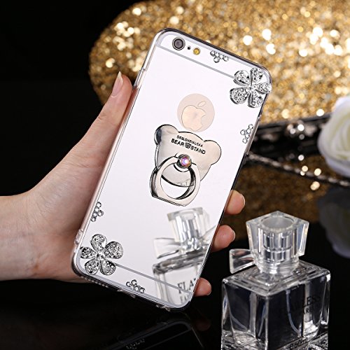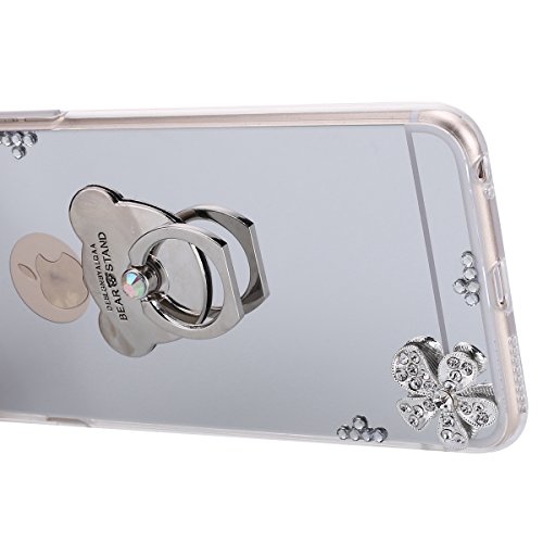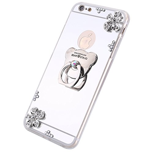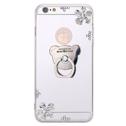 Custodia iPhone 6/6S Plus Glitter,iPhone 6/6S Plus Custodia in Silicone,Uposao Lusso Bling Glitter Strass Diamante Specchio Cover con Orso Anello Supporto Custodia per iPhone 6/6S Plus-(Argento)