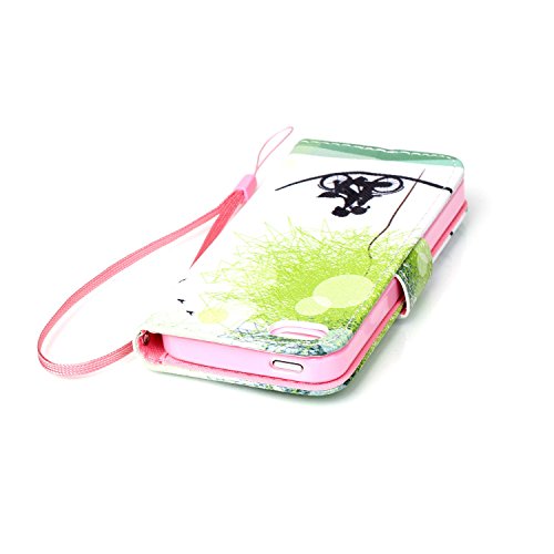 Custodia iPhone SE, ISAKEN Cover iPhone 5S con Strap, iPhone 5 5S SE Flip Custodia Cover Case, Creative Disegno stampa stile del libro Portafoglio Cover Case in PU Cuoio Wallet Caso copertina con funzione di supporto e morbido TPU cassa interna per iPhone 5S 5 - verde bike coppia love