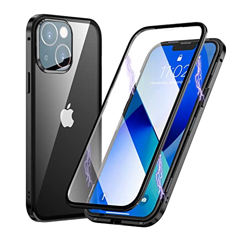 Custodia per iPhone 13 Mini Magnetico Cover,360 gradi Full body Antiurto Protezione Paraurti in Metallo Case [Protezione Camera] Doppi Lati Trasparente vetro Temperato Case,Nero