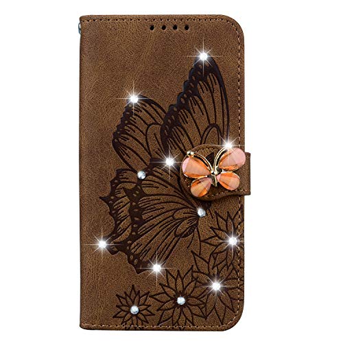 VQWQ Custodia per iPhone 12 6.1" - Custodia in Pelle iPhone 12 6.1" Cover Glitter Strass a Libro con Porta Carte Portafoglio iPhone 12 6.1" Cover [Farfalla] -Marrone