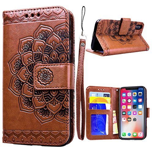 Custodia per iPhone X in Pelle, GrandEver Magnificamente Fiori Pattern Anti-Scratch Premium PU Leather Magnetico Flip ID Slot per Scheda Wallet Case Protettiva Cover - Marrone