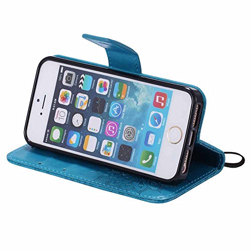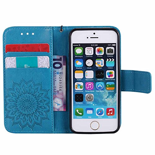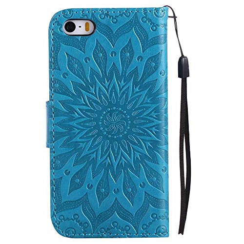 Dfly, custodia morbida per iPhone SE / iPhone 5S / iPhone 5, in similpelle morbida, a portafoglio, in pelle goffrata con design a mandala, supporto tasca per carte di credito, sottile cover protettiva blu Blue iPhone SE/5S/5