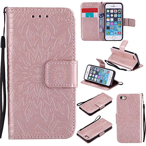 Dfly, custodia morbida per iPhone SE / iPhone 5S / iPhone 5, in similpelle morbida, a portafoglio, in pelle goffrata con design a mandala, supporto tasca per carte di credito, sottile cover protettiva rosa e oro Rose Gold iPhone SE/5S/5