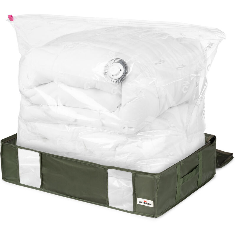 Scatola di conservazione sottovuoto all-in-one pronta all'uso Risparmia 3 volte più spazio nei tuoi armadi Copertura esterna realizzata con bottiglie di plastica riciclate Utilizzabile con qualsiasi tipo di aspirapolvere dotato di tubo flessibile Consente la conservazione sottovuoto dell'equivalente di 1 piumone matrimoniale + 1 piumone singolo Conservazione ed ecologia fanno rima con questo contenitore sottovuoto che utilizza bottiglie di plastica riciclate per il suo rivestimento esterno. Grazie alla sua sacca di compressione in lino integrata, risparmierai fino al 75% in più di spazio nei tuoi guardaroba! Come per magia, con un semplice aspirapolvere, la tecnologia Compactor rimuove l'aria contenuta nelle fibre tessili. Senza essere danneggiati, i tuoi vestiti e tessuti ingombranti sono compressi, perfettamente protetti da polvere, tarme, acari e umidità. È la soluzione ideale per liberare spazio, organizzare gli scaffali, ordinare ad ogni cambio di stagione e facilitare lo storage