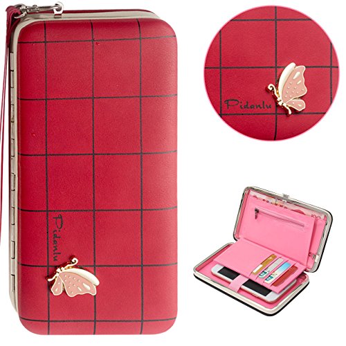 Custodia multifunzione borsetta per donne, ragazze Bonice farfalla universale a scacchi in custodia in pelle lungo borsa del sacchetto frizione PU patente ID carte di credito passaporto da polso cordino Hasp chiusura grande capacità borsa custodia per iPhone x/8 Plus/8/7 Plus/7/6s Plus/6s/6/se/5S/5 C/5/4S/4, Samsung Galaxy Note 8/S8 Plus/S8/S7/S7 Edge/S6 Edge/S6/S5/S4, colore nero S - Red