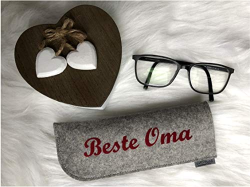 Custodia per occhiali in feltro di lana al 100%, con scritta (in tedesco) “Beste Oma”, colore: grigio chiaro-rosso.