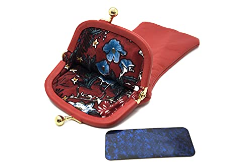 Dimensioni (chiusa): 18,5 cm x 8 cm x 1,5 cm. Materiale. Esterno: pelle di agnello morbida, interno: tessuto tipo liberty stampato con motivo fiori e foglie. Struttura metallica dorata. Peso: circa 42 g.