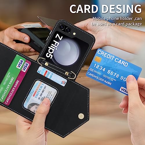Custodia a portafoglio con cerniera per Samsung Galaxy Z Flip 5 5G, custodia a tracolla con porta carte di credito e cordino, da donna, con cavalletto, in pelle (Z Flip 5, nero)