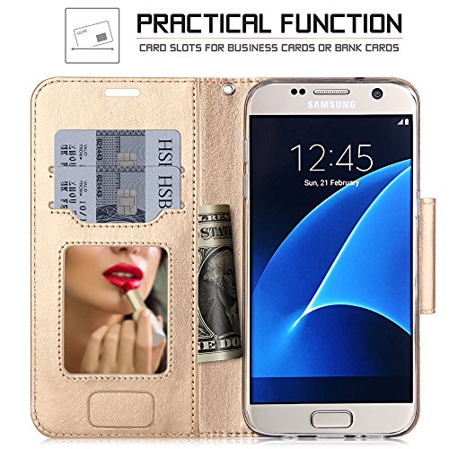 FYY - Custodia a portafoglio per Galaxy S7, [serie di prima classe] - custodia di pelle a portafoglio, con sezione per carte di credito, porta foto, tasca per monete e cinturino da mano per Samsung Galaxy S7. - F-oro S7