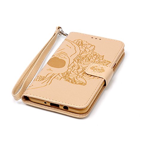 Custodia per Samsung Galaxy J7 2016 J710,Funyye Cover Pelle Elegante Libro Protettiva Copertura Con Cordino Shell Supporto Stand Porta Carte Portafoglio Flip Wallet Cover Chiusura Magnetica Proteggi Caso - Fiori Cranio Oro