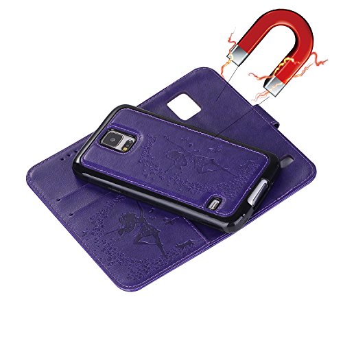 Custodia per Samsung Galaxy S5 Portafoglio 2 in 1,Girlyard Elegante Ragazza Farfalla Disegno Carino Gatto Flip Case Funzione Amovibile Supporto Magnetico Protezione Coperture in Pelle et Morbido TPU Silicone per Samsung Galaxy S5 (Porpora)