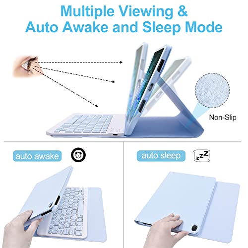 【Custodia protettiva】 Realizzata con un esterno in pelle PU premium, chiusura magnetica pieghevole e una custodia interna in plastica resistente. La morbida calotta interna, protegge il tuo tablet da cadute e graffi. E questa custodia Galaxy A7 da 10,4 "con strato interno della tastiera fornisce un cuscino a griglia a nido d'ape che può rilasciare più calore, proteggere il tablet dal surriscaldamento. E il design pieghevole del colore blu cielo è molto curativo.