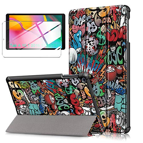 LJSM Custodia + Vetro Temperato per Samsung Galaxy Tab A 10.1" 2019 T510 / T515 - Pellicola Protettiva, Guscio Supporto Protettiva Tablet Cover in Pelle Flip PU Case - Graffiti