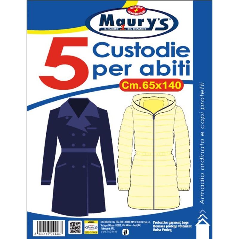 Per il tuo guardaroba le custodie Maury's sono l'ideale per tenere lontano polvere. umidità e sporco dai tuoi vestiti. Copriabiti per armadio Colore: trasparente Materiale: plastica Misure: 140 x 65 cm Confezione da 5pz Cambio stagione