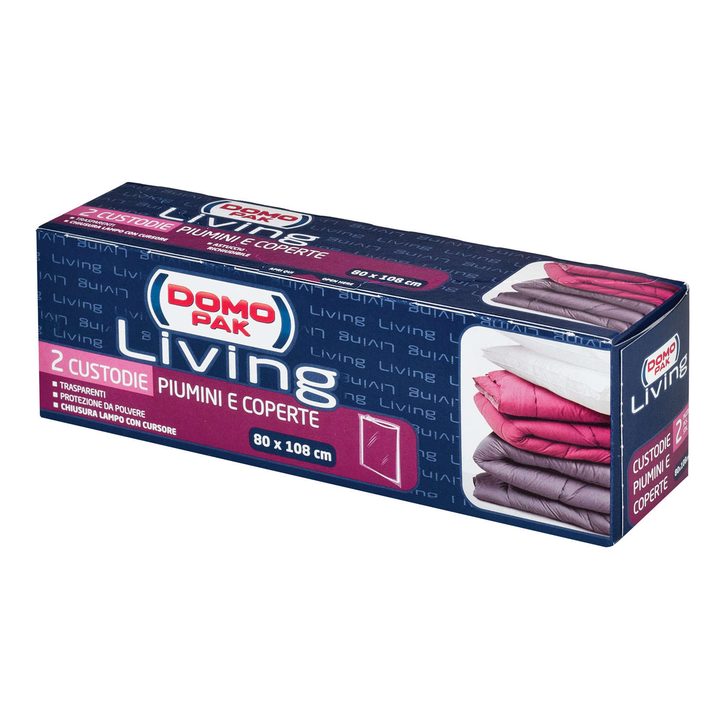 Trasparenti e con chiusura lampo con cursore, le custodie per piumoni e coperte contenute nella confezione da 2 di Domopak Living sono perfette per conservare la tua biancheria da letto in ordine nei tuoi armadi o durante i viaggi. In resistente materiale sintetico, la proteggono da polvere, umidità e muffa, mantenendola fresca e pulita. Dimensioni: 80x108 cm.