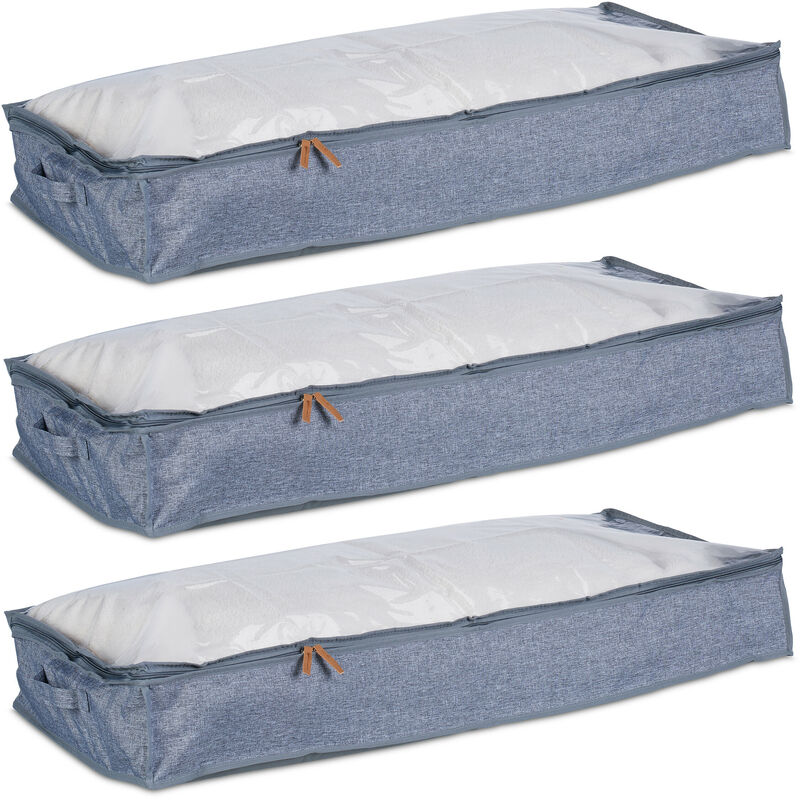 Le custodie sottoletto sono perfette per riporre comodamente vestiti, coperte, biancheria da letto e altro ancora sotto il letto o sopra l'armadio. La robusta cerniera garantisce un facile accesso e protegge efficacemente il contenuto dalla polvere. La finestra trasparente in consente di vedere sempre cosa c'è all'interno dell'organizer per la base del letto. Con questi sacchetti salvaspazio, potrai tenere in ordine le lenzuola, gli asciugamani o i vestiti nel cambio stagione. Set da 3 organizzatori sotto letto in dettaglio - Dimensioni ogni box H x L x P: 14 x 100 x 45 cm ca. - Peso per ogni box: 190 g ca. - Materiale: poliestere, PP, PE - Colore: grigio, trasparente Organizer sottoletto in stoffa con cerniera - Conservazione di vestiti, coperte, biancheria da letto e molto altro - Sfrutta al meglio lo spazio inutilizzato sotto il letto - Lato trasparente per una facile identificazione del contenuto - Zip su entrambi i lati per un facile accesso al contenuto - Le scatole sotto il