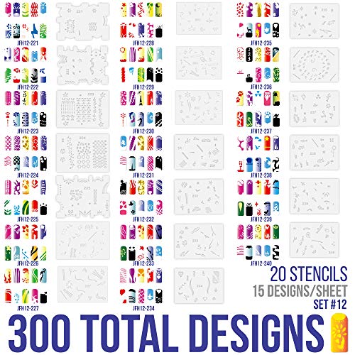 Custom Body Art Stencil per unghie aerografo, set serie n. 12, include 20 modelli individuali per unghie con 18 disegni ciascuno per un totale di 360 modelli di serie #12