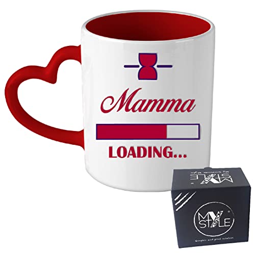 Tazza da 325ml, con manico a CUORE ROSSO in ceramica #Mamma - Mamma Loading# . Stampata con tecnica sublimatica, per un risultato di eccezionale bellezza.