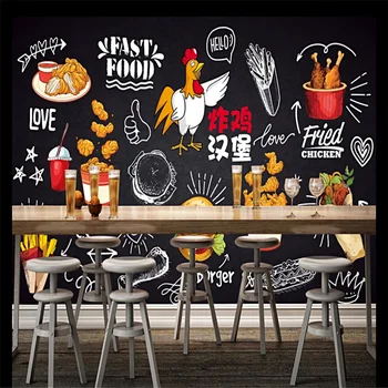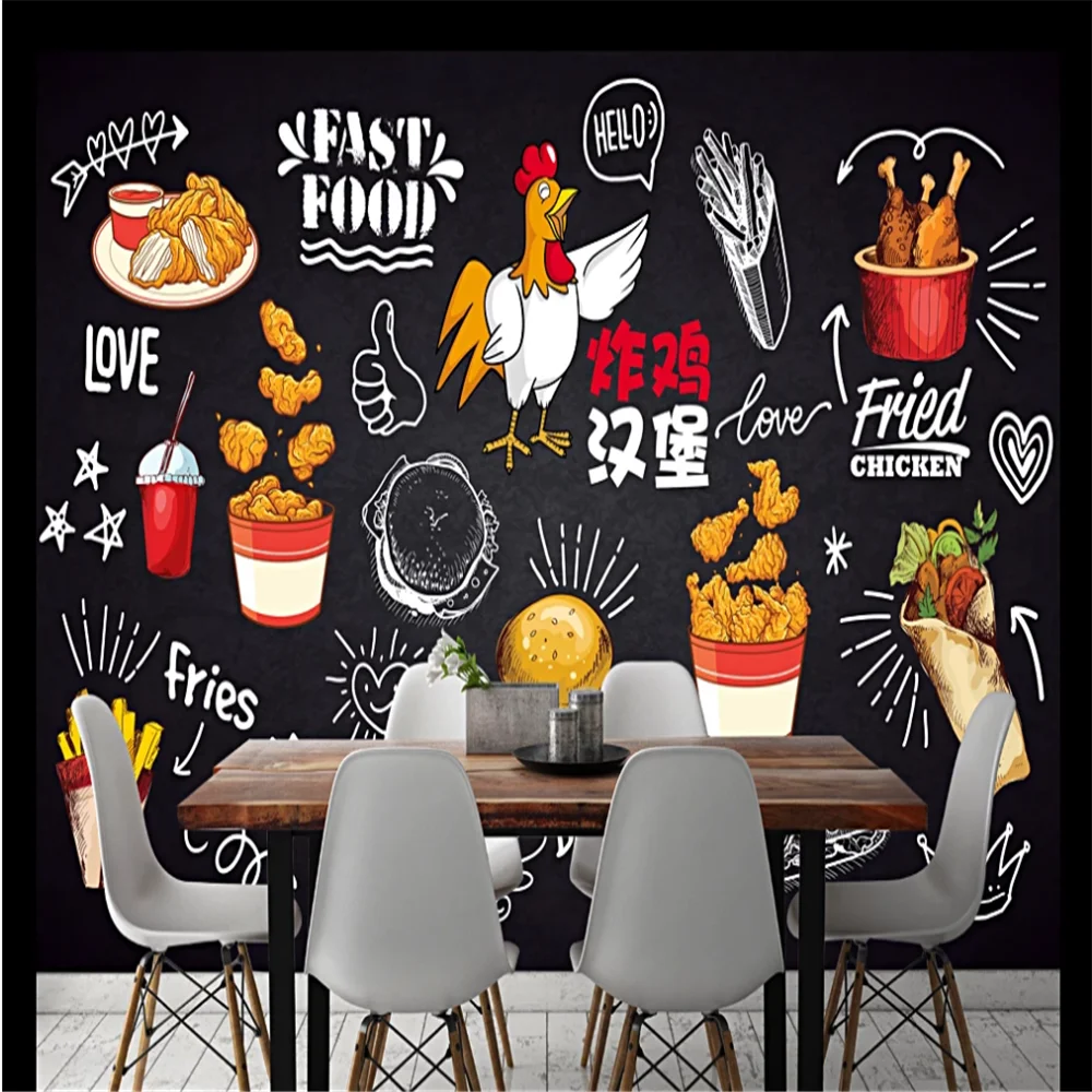 Custom 3D wallpaper mural blackboard hand-painted fried chicken burger food gourmet fast food fries background wall