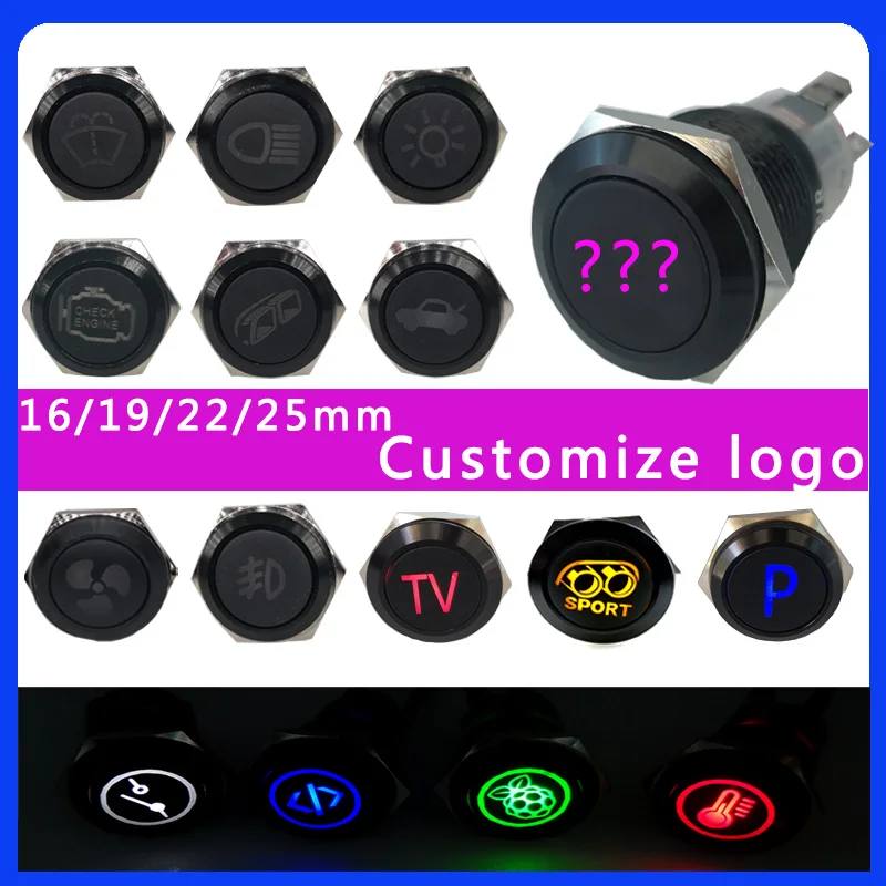 Customizable 19mm Alumina Momenary/Latching for car speaker horn Wipper button switch Led logo symbols light fixed Car hazard