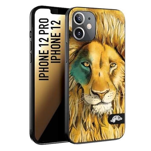 CUSTOMIZZA - Custodia cover nera morbida in tpu compatibile per iPhone 12-12 PRO leone lion disegnato a mano giallo blu a rilievo artistico brown