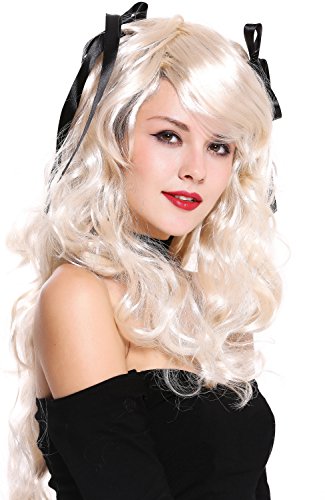 Parrucca da donna molto carina, per Halloween, cosplay e carnevale, in stile lolita gotica- i lunghi e ondulati capelli sono in un mix di due tonalità di biondo molto chiaro e i due fiocchetti neri contrastano in modo davvero grazioso.