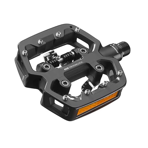IL PEDALE IBRIDO IN ALLUMINIO: non c'è più bisogno di scegliere tra pedali piatti e pedali automatici. I due lati dei pedali ibridi a due facce GEO Trekking Roc ti accompagnano su qualunque terreno. Il corpo in alluminio garantisce una robustezza impressionante, mentre la forma concava dei pedali offre una superficie di appoggio di 84 mm, con un peso appena superiore a 200 grammi.