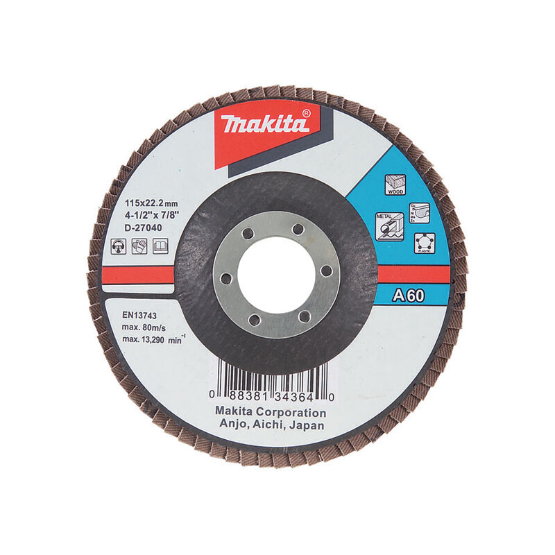 MAKITA D-27034 Disco lamellare in ossido di alluminio 115mm G40 Valido per un'ampia varietà di materiali: metalli ferrosi, non ferrosi, plastica e legno. Utente vantaggi Dischi con abrasivo all'ossido di alluminio, validi per un'ampia varietà di materiali: ferrosi, non ferrosi, plastica e legno. Specifiche Grana - 40 - Descrizione - Curvo - Diametro - 115 - mm Diametro interno del disco - 22,23 - mm< /li> Materiale - Fibra - Giri/min max. - 13.290 - Giri/min