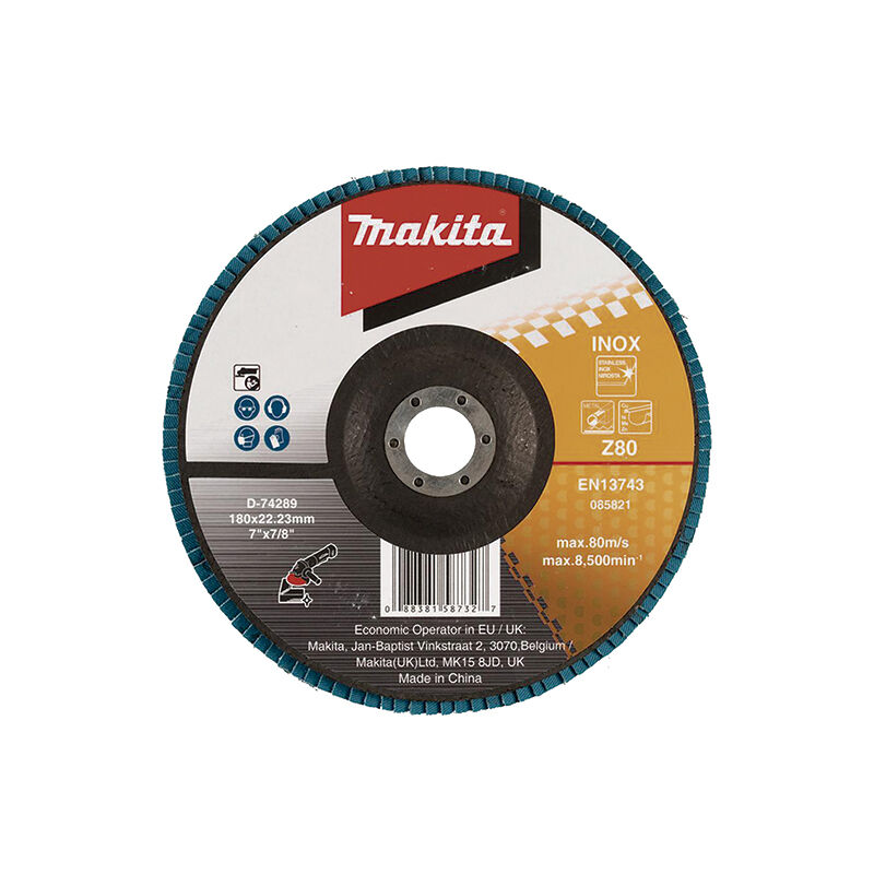 MAKITA D-74289 Disco lamellare 180 (G80) metallico Disco con abrasivo allo zirconio. Compatibilità Grana - 80< /p >Descrizione - Acciaio inossidabile e metallo Diametro - 180 - mm Diametro interno - 22,23 - mm