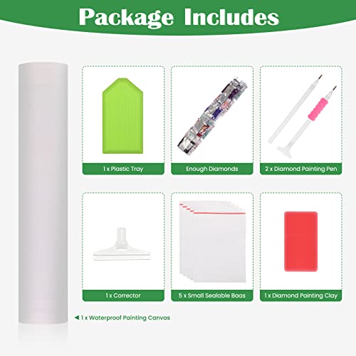 Cosa si ottiene: 1 pezzo di tela diamond painting kit includono abbastanza perline di strass di resina (senza cornice), 1x tela trasparente impermeabile per la pittura, 1x vassoio, 1x argilla per pittura diamante, 2x penna diversa per la diamond painting, 5x piccoli sacchetti per conservare i diamanti.