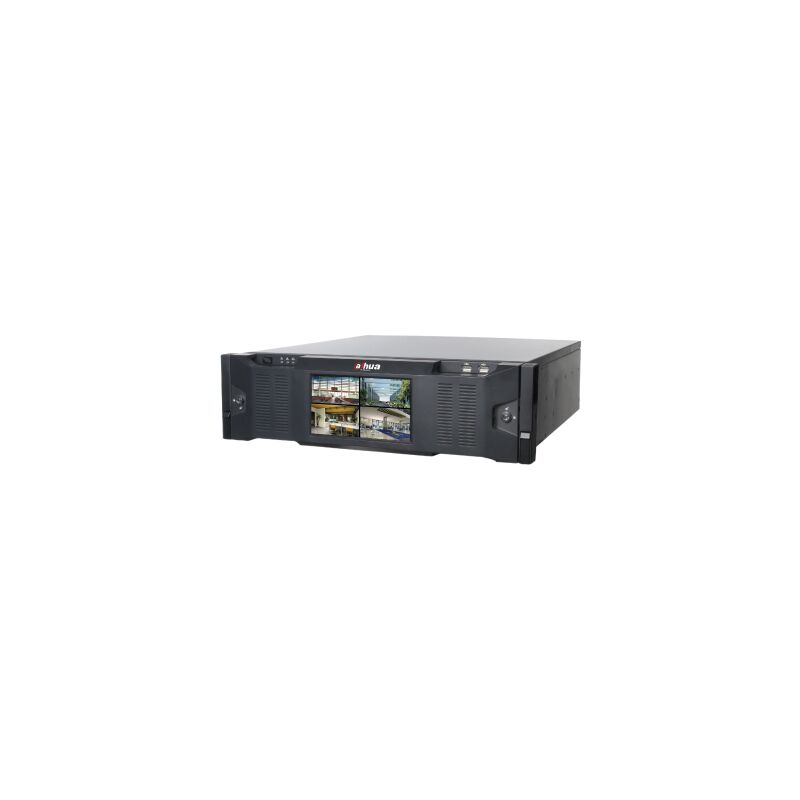 NVR 64 canali IP fino a 12 MP (recording), 4 canali 8 MP/16 canali 1080p (decoding), massima banda 384 Mbps, 3 uscite video (1 VGA + 2 HDMI) e 1 monitor LCD da 7" integrato, 16 ingressi e 8 uscite allarme, 1 ingresso e 1 uscita audio, predisposto per montaggio di 16 Hard Disk SATA (fino a 10 TB cad.), 4 porte USB (2 2.0 e 2 3.0), 1 porta eSATA, 1 porta mini SAS, 1 porta RS232, 1 porta RS485, 4 porte LAN 1000 Mbps, 3U, alimentazione ridondante 240 Vac