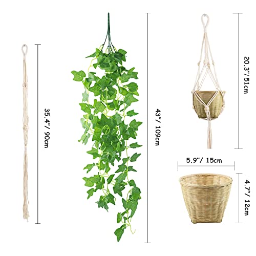 Confezione da 2: include 2 grucce per piante macramè, 2 cesti fatti a mano, 2 viti finte di edera. L'intera lunghezza d'attaccatura: 51,6 cm (dalla parte superiore del gancio macramè al botton del cestino), dimensioni cestino: 11 x 11 x 15 cm (lunghezza x larghezza x altezza). Lunghezza delle piante: 109,2 cm