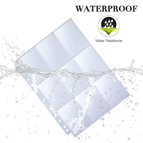 Materiale Sicuro ed Ecologico: Trasparente accessori per carte collezionabili è realizzato in pellicola PP trasparente di alta qualità, resistente all'usura e ai graffi, la pagina interna non si attacca, la scheda si inserisce facilmente ed è molto flessibile e non ferire la carta. La trasmissione della luce raggiunge il 98% e il contenuto della carta è chiaramente visibile.