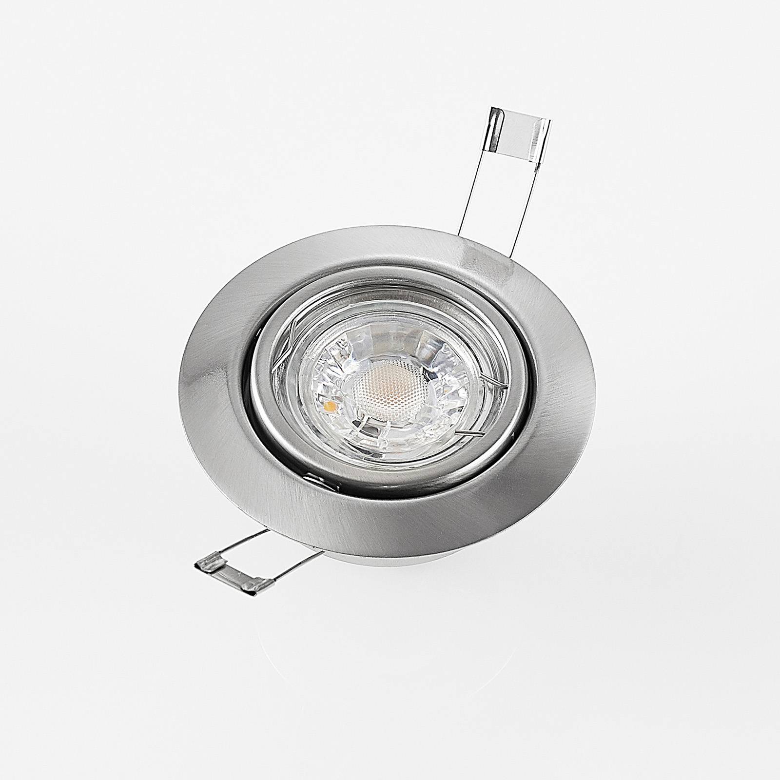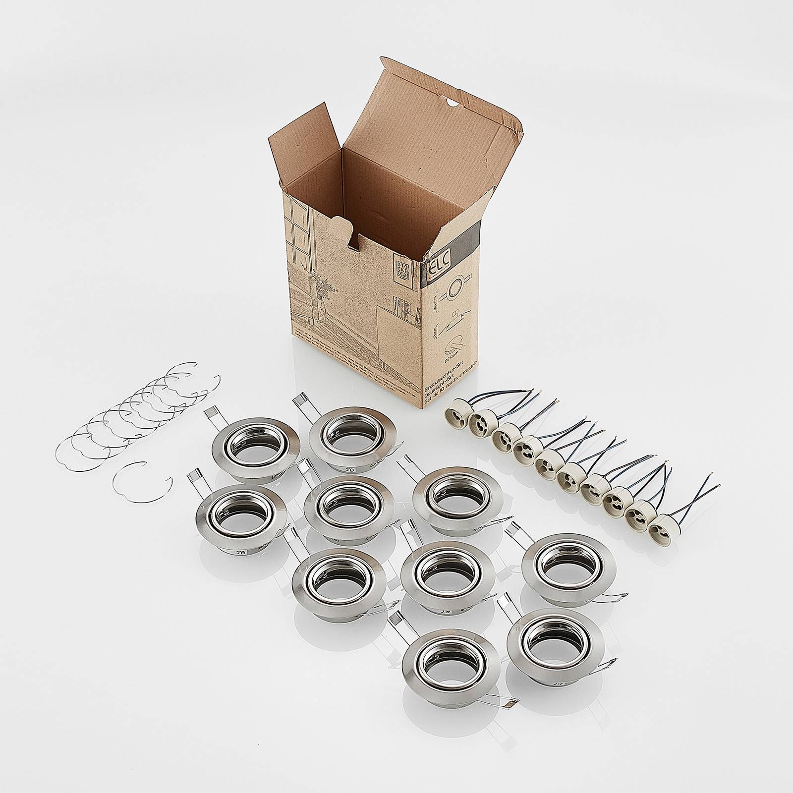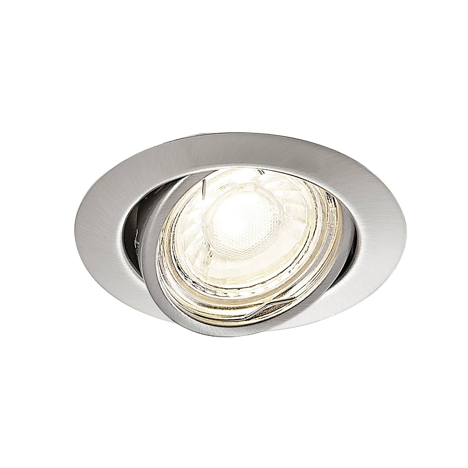 Downlight da incasso Dakarra rotondo in moderno look nichel, orientabile, in pratica confezione da 10 L'involucro del downlight Dakarra è in robusto metallo con raffinata finitura nichel. Sia il colore che la semplice forma rotonda si prestano a un'illuminazione universale. Le lampadine ad attacco GU10 si inclinano di ca. 30° in modo da adattare l'emissione e la direzione della luce. La fornitura comprende un set di 10 lampade. Con queste si possono illuminare diversi locali oppure creare un'illuminazione intensa in un locale grande.