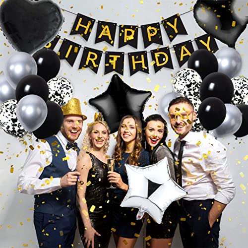 Decorazione di compleanno argento nero: 2 palloncini con numero (32 in) + ghirlanda Happy Birthday + 16 palloncini in lattice + 8 palloncini con coriandoli + 2 palloncini a forma di cuore (18 pollici) + 2 palloncini a forma di stella (18 pollici) + nastri per palloncini.