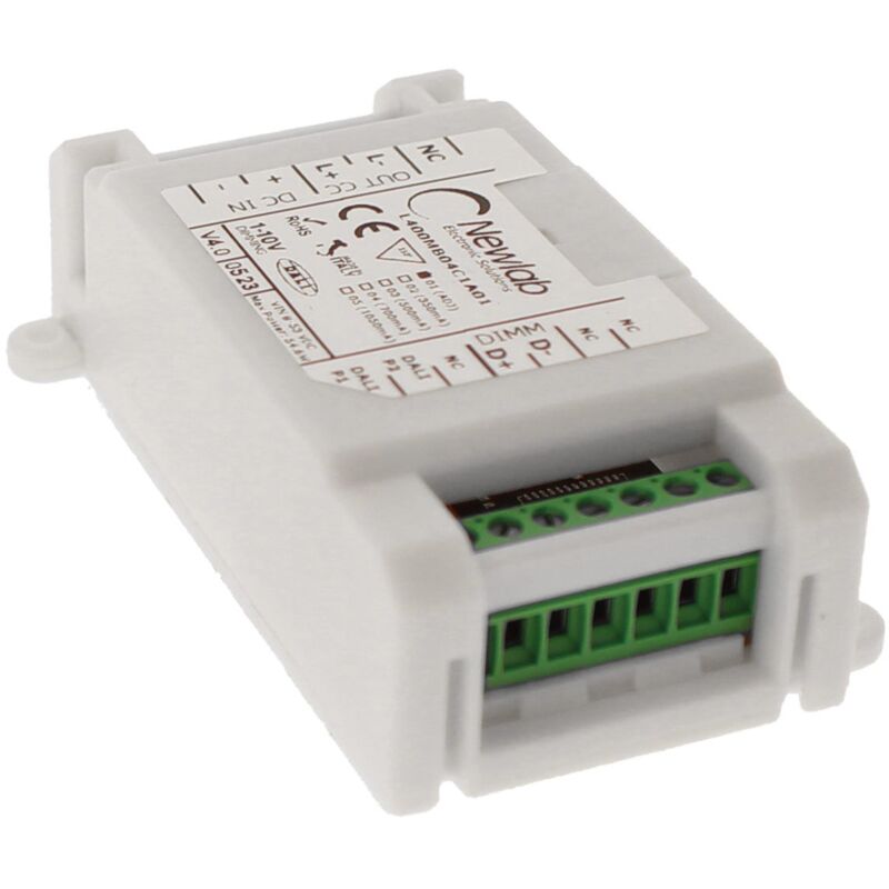 NEWLAB DALI-CC L400MB04C1A01, Led Dimmer monocanale in corrente costante regolabile da 170mA fino a 1050mA Ingresso 4 In 1: DALI/PUSH/POT/1-10V .Dimmer Monocanale con Uscita in Corrente PWM. Range di alimentazione: 8-53V DC. Uscita in Corrente PWM con corrente costante da 170mA a 1050mA (Massimo 54.6W a 52V DC). Per impostare le correnti di uscita occorre dotarsi di interfaccia L392MA00N0A01 (SKU:NL-SETUPPER) venduta separatamente. Corrente di default 350mA. Per impostare il fade e la curva logaritmica/lineare di uscita occorre dotarsi di interfaccia L392MA00N0A01 (SKU:NL-SETUPPER) venduta separatamente Le modalità difunzionamento vengono riconosciute e impostate automaticamente dal dispositivo senza bisogno di interfaccia esterna. NEWLAB DALI-CC L400MB04C1A01, Led Dimmer monocanale in corrente costante regolabile da 170mA fino a 1050mA Ingresso 4 In 1: DALI/PUSH/POT/1-10V .Dimmer Monocanale con Uscita in Corrente PWM. Range di alimentazione: 8-53V DC. Uscita in Corrente PWM con
