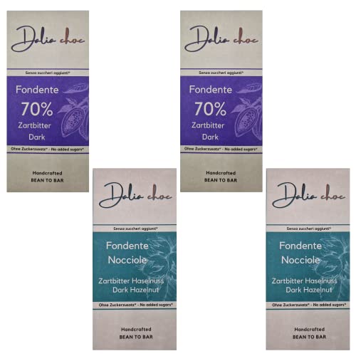 Dalia Choc - Tavolette di cioccolato PREMIUM 4 x 70 gr | Senza Aggiunta di Zuccheri - dolcificato con Eritritolo | Prodotto in ITALIA | BEAN TO BAR (Fondente (2x70gr) e Fondente-Nocciole (2x70gr))