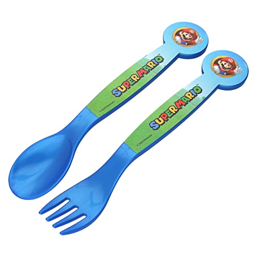 Il set posate Super Mario per bambini include due cucchiaini plastica Super Mario per bambini e due forchettine Super Mario per bambini