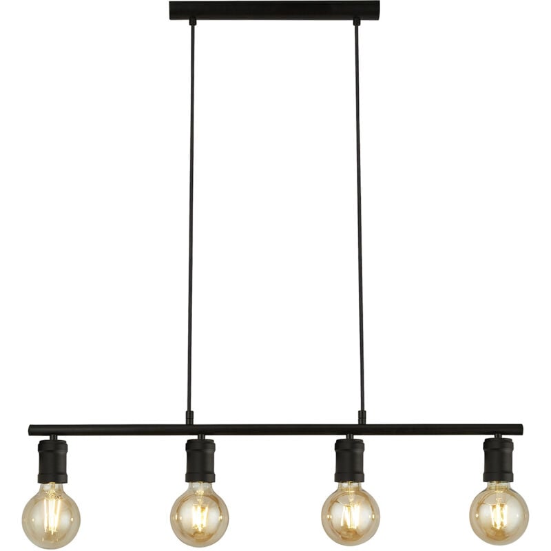 Collezione Danza DIREZIONA LA TUA LUCE Questa sospensione a 4 barre è una dichiarazione accattivante e ideale per l'uso su qualsiasi bancone per la colazione o tavolo da pranzo. L'audace barra nero sabbia è regolabile in altezza e pende da una piastra di soffitto rettangolare nera, lasciando le lampadine vintage una vista come caratteristica.