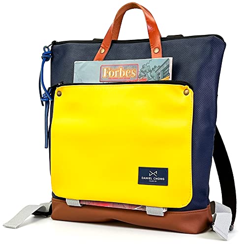 Daniel Chong - Zaino per Computer Portatile Unisex - Resistente all'Acqua - per Notebook fino a 13" - Borsa Leggera Quadrata Casual - Volume 6 Litri (Blu con tasca gialla e base marrone)