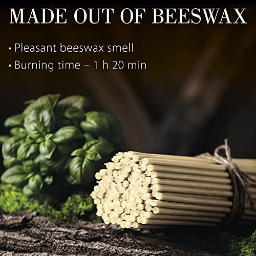 Candele ortodossiche: tutte le candele della confezione da 100 soddisfano i più alti standard di qualità. Tempo di combustione di 1 ora e 20 minuti, 19,5 cm di lunghezza e 7 mm di spessore per arricchire la meditazione, la preghiera, il rituale e l'altare domestico. Adatto anche come candela di compleanno.