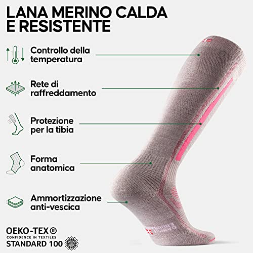 DANISH ENDURANCE Calze da Sci in Lana Merino, Termiche, Tecniche, Traspiranti, Uomo, Donna e Bambino, Grigio Chiaro/Rosa, 35-38