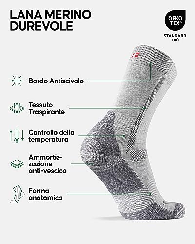 DANISH ENDURANCE Calze Trekking in Lana Merino, Anti-Vescica, Calzini Escursionismo da Uomo, Donna, Bambino, Grigio, 43-47