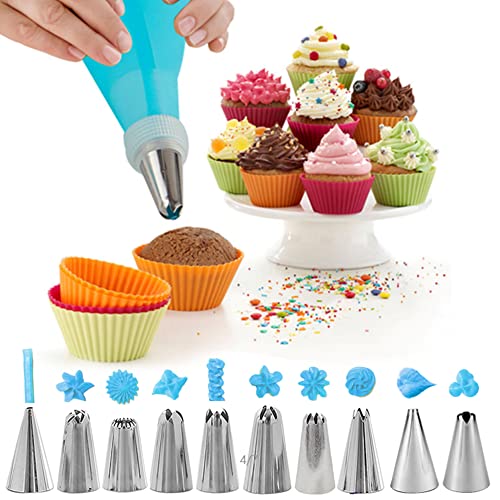 【Set di 39】 -28 diversi ugelli tra cui scegliere, 2 convertitori,2 sacche da pasticcere, 2 anelli di fissaggio blu, 2 spazzole per la pulizia, 3 raschietti blu, le forme degli ugelli includono stella aperta, stella chiusa, tonda,, petali, ecc. Puoi creare decorazioni di forme diverse in torte o biscotti e dare libero sfogo alla tua creatività
