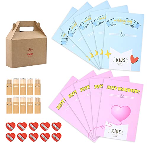 Libro da colorare per bambini: Riceverete 10 libri passatempo per matrimonio, 10 scatole di matite (6 per scatola) e 10 temperamatite. A porta divertimento con 8 pagine piene di colori e puzzle ed è un ottimo regalo di nozze per i bambini.