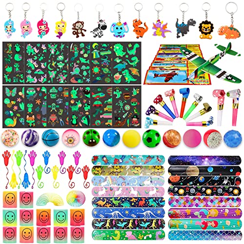 Giocattoli selezionati di alta qualità: 100 pezzi di bomboniere per bambini, inclusi aeroplani di polistirolo fai-da-te 12 miscele, portachiavi di dinosauro 12, palline rimbalzanti bulbo oculare 12, braccialetti a scatto 16 (sirena, oceano, spazio, dinosauro, foresta, unicorno) 6 tipi di elementi misti, 12 cerchi che saltano sorridenti, 12 draghi che soffiano, 12 adesivi luminosi per tatuaggi, 12 mani appiccicose. Combina con cura una varietà di divertenti giocattoli da festa